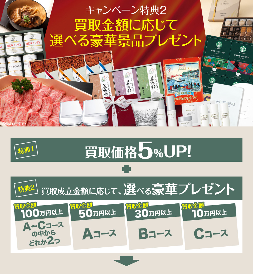 ・特典2は買取金額10万円より。最高金額は買取金額100万円以上となります。